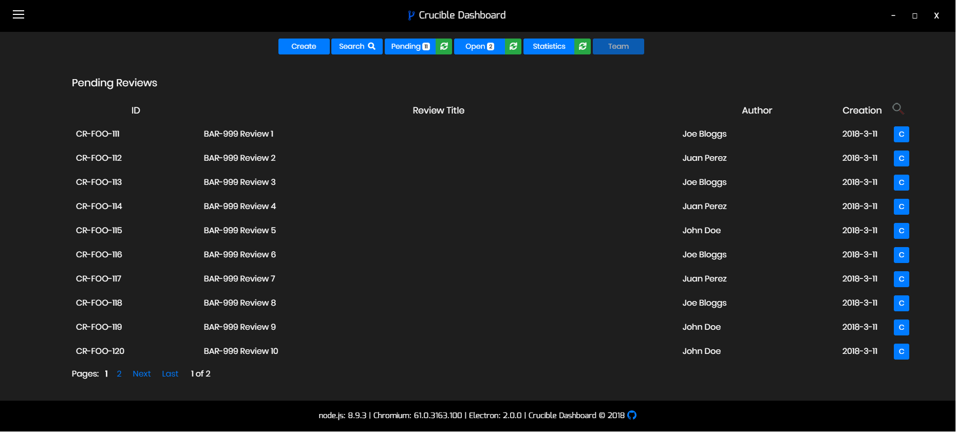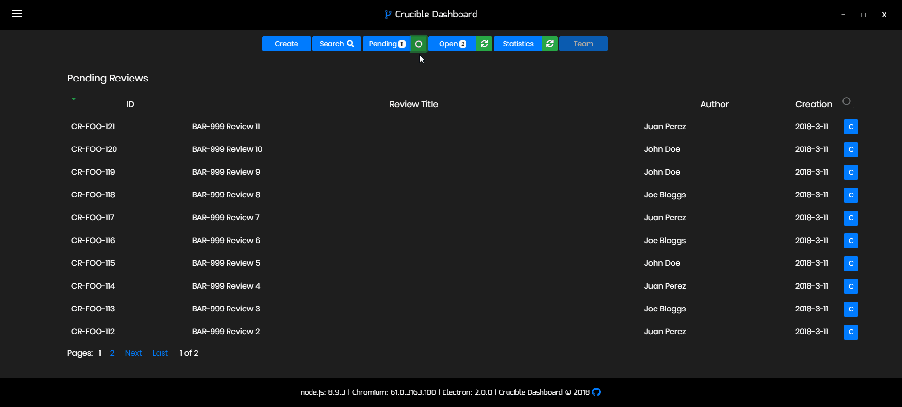 Open updates the App with a table of open reviews (reviews that you have created & are currently open).