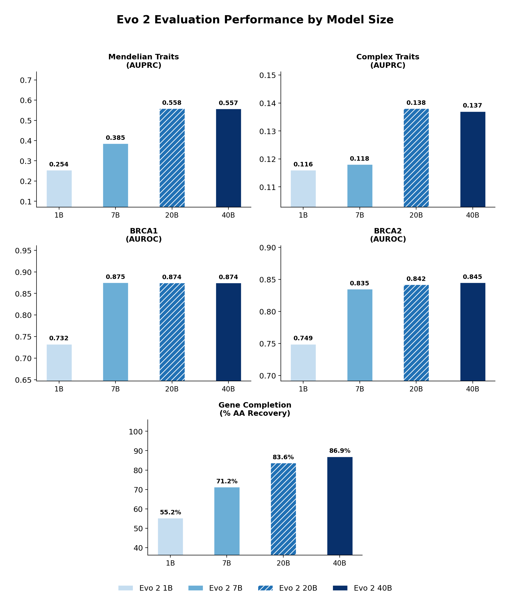 Evo 2 model comparison across benchmarks. Performance of Evo 2 1B, 7B, 20B, and 40B on variant effect prediction (TraitGym, BRCA1, BRCA2) and gene completion. Evo 2 20B closely matches Evo 2 40B across all tasks.