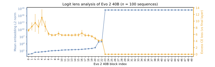 Logit lens analysis of Evo 2 40B. Orange: mean embedding L2 norm by block. Blue: excess cross-entropy (bits) relative to the final layer. The plateau in cross-entropy beyond block ~20 indicates that later layers contribute minimally to next-token prediction, while their activation norms spike dramatically.