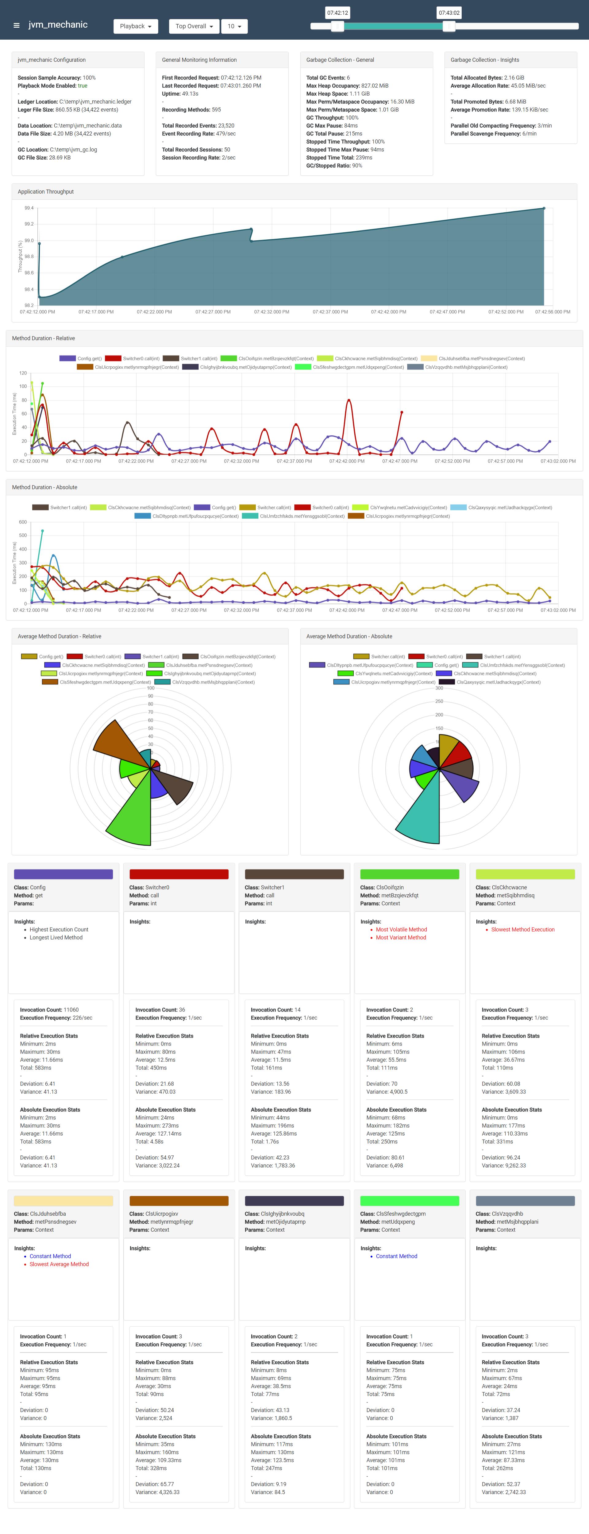 - Garbage collection contribution (max/min/mean/avg/ratio) by method (relative/absolute by method/stream)