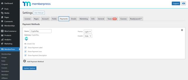 First of all, you must have one of the Lite or Premium versions of CryptoPay. Because this is an integration plugin. Of course, MemberPress must also be installed. After activating CryptoPay, you need to go to the payment area in your MemberPress settings and add CryptoPay as a payment option.