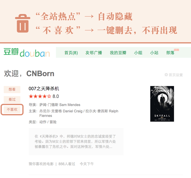 豆瓣首页进化 - Chrome/Firefox插件 安装: Chrome版 Firefox版(需Greasemonkey) 功能简介: 自动滤去“全站热点”、“小卖部”。(若首页为空,请在“首页设置”中选择感兴趣的信息类型,以获得更个性化的推荐) 点击“不喜欢”后条目进入黑名单,日后不再出现。 首页“日记”现可以展开全文 自动去掉豆瓣首页/广播页面的“小组应用”广告 去掉全站黑色导航(老用户可能需要重新为插件授权) 截屏