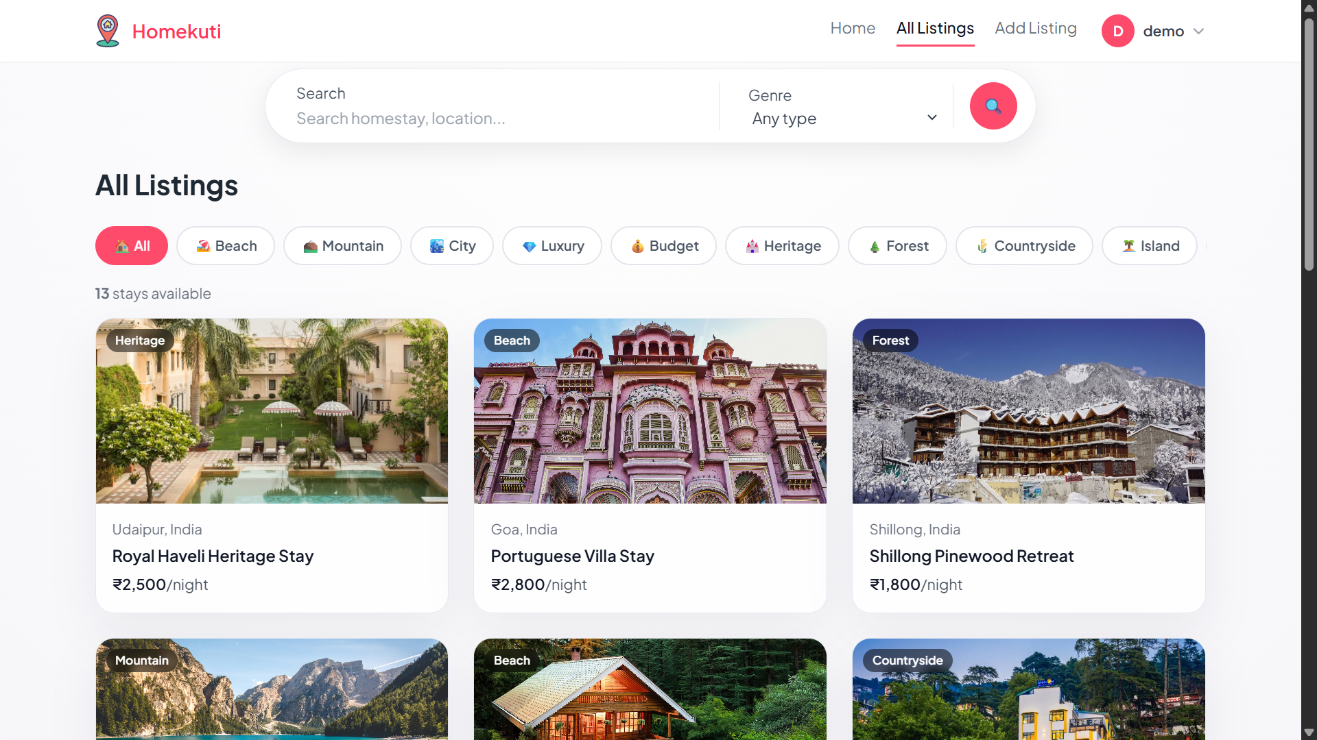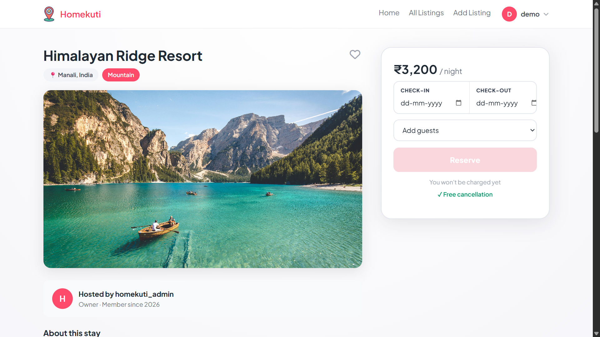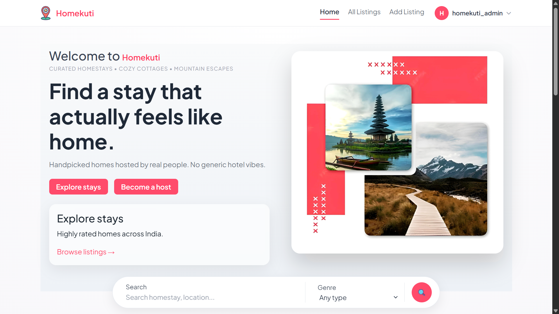 Homekuti is a full-stack homestay booking platform that enables users to discover, book, and manage stays with secure authentication, real-time availability, and seamless online payments.