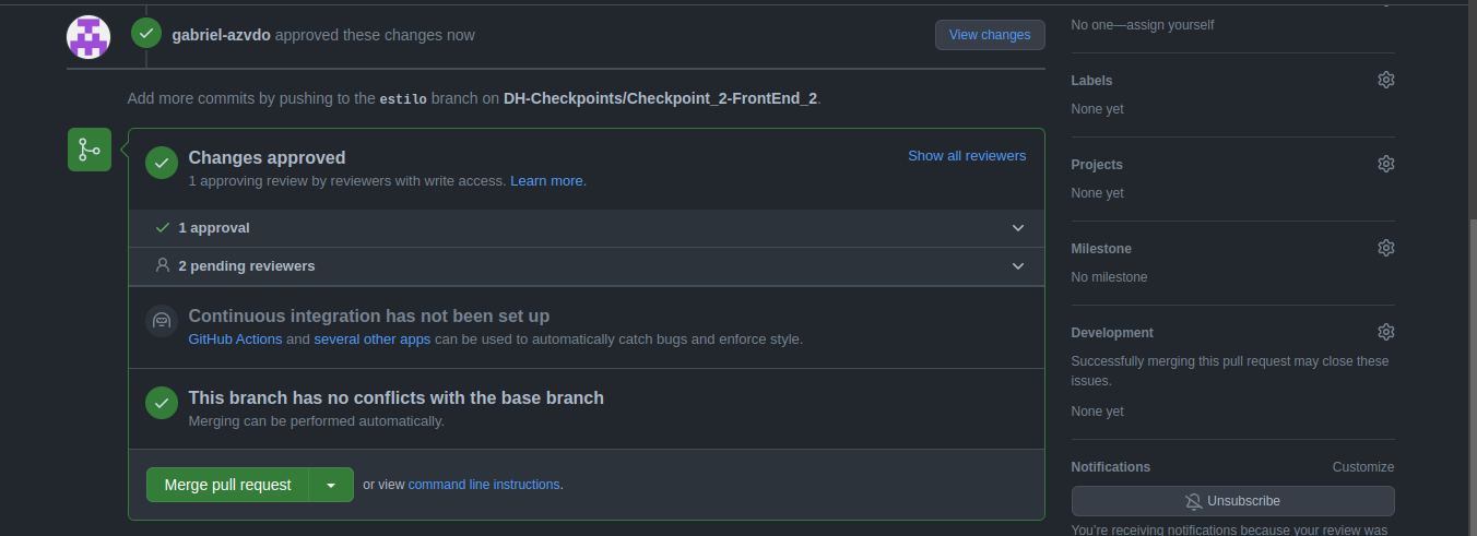 - Selecionando o approve(aprovação) e enviando, a tela seguinte é para fazer o merge para a main, e o solicitante ou o revisor poderá realizar o merge para a main.