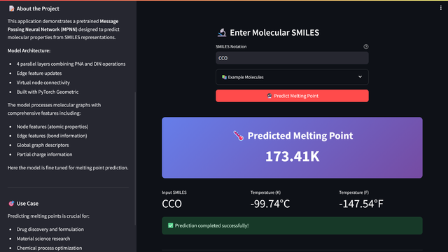 A sophisticated deep learning application that predicts molecular melting points from SMILES notation using a custom Message Passing Neural Network (MPNN) architecture with PNA and DIN layers.