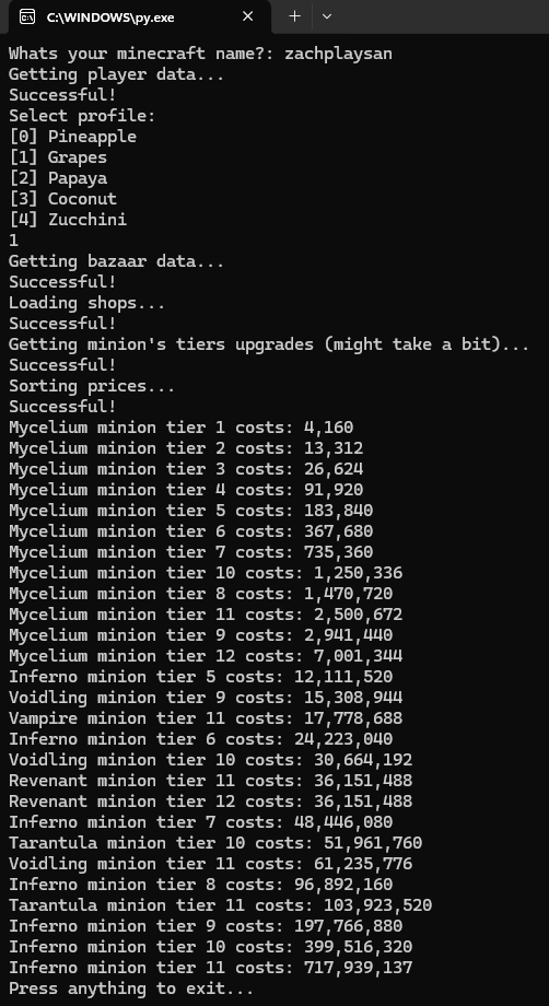 Python script that generates a list of your missing minion's tiers from the cheapest to the most expensive.