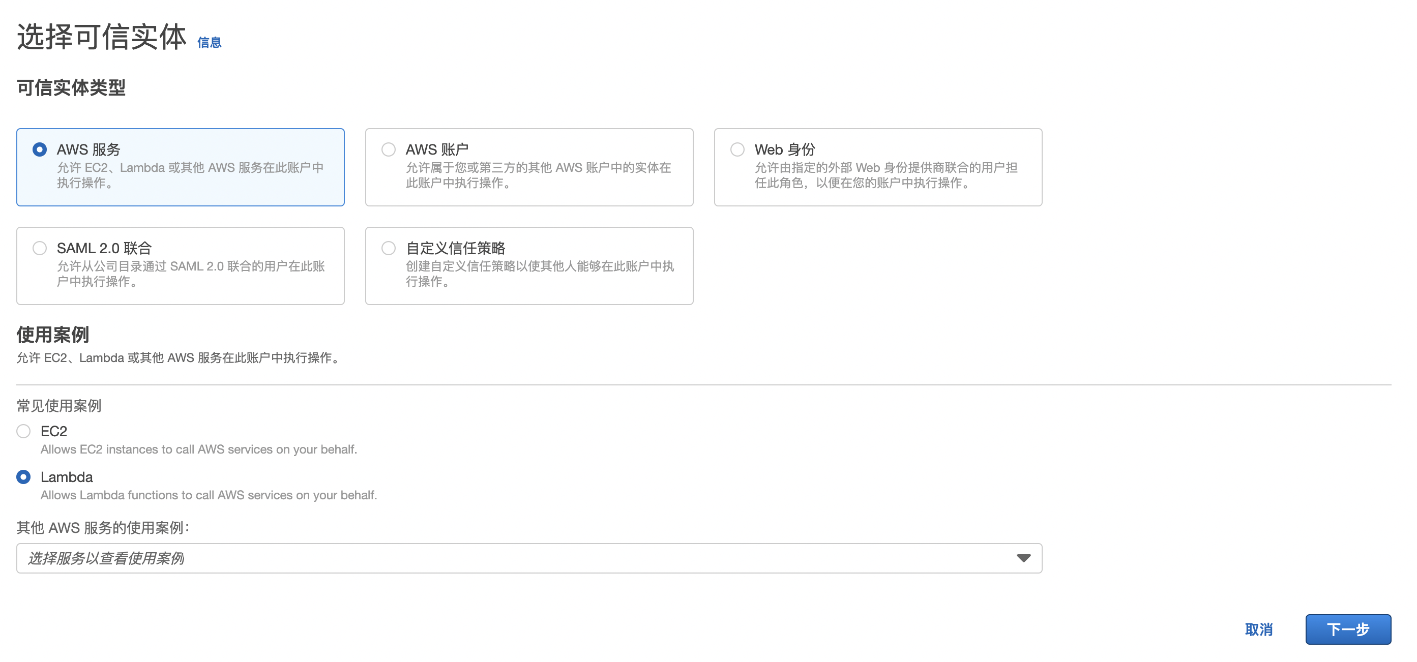 进入 IAM 控制台,选择 访问管理 - 角色 创建新的角色。可心实体类型选择 AWS 服务,并勾选使用案例为 Lambda: