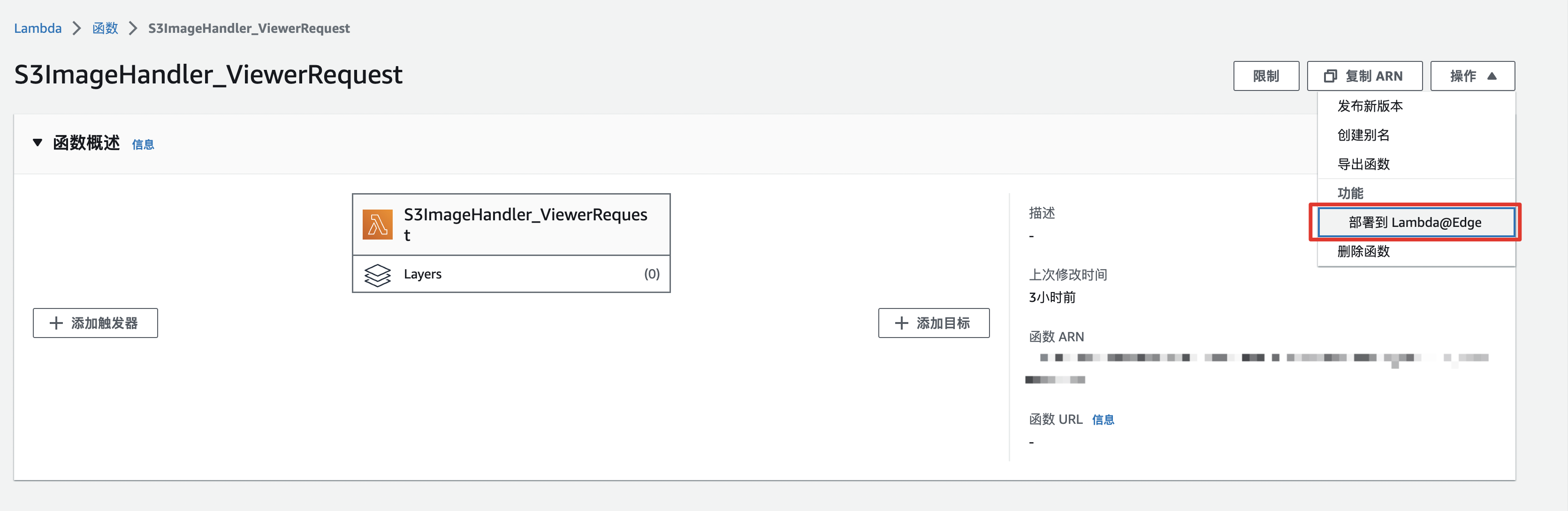 首先部署 S3ImageHandler_ViewerRequest 到 ViewerRequest 上,点击 S3ImageHandler_ViewerRequest 函数进入详情,点击右上角 操作 - 部署到 Lambda@Edge: