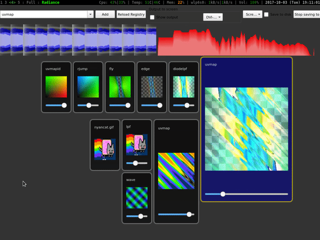 Radiance is video art software for VJs. It supports beat detection, animated GIFs, YouTube video, OpenGL shader effects. It is designed for live performance and runs on Linux and MacOS.