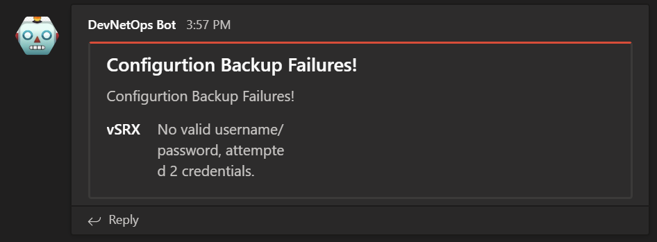 This project expands on the work by @minitriga for netcfgbu (0.8.0) which enables the creation of plugins. These python plugins can be used to create extra functionality. In my case I made a plugin which integrates with MS Teams. The reason for this is because Teams is the primary messaging tool at my company. This allows me to have multiple people to be alerted to a backup and any problems that it may have. Or to keep a log of when it was ran and the results.