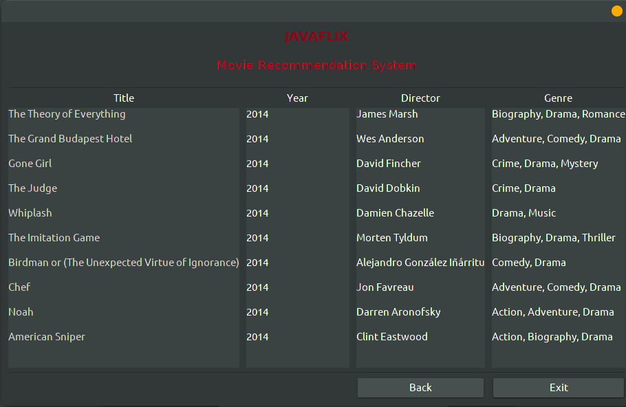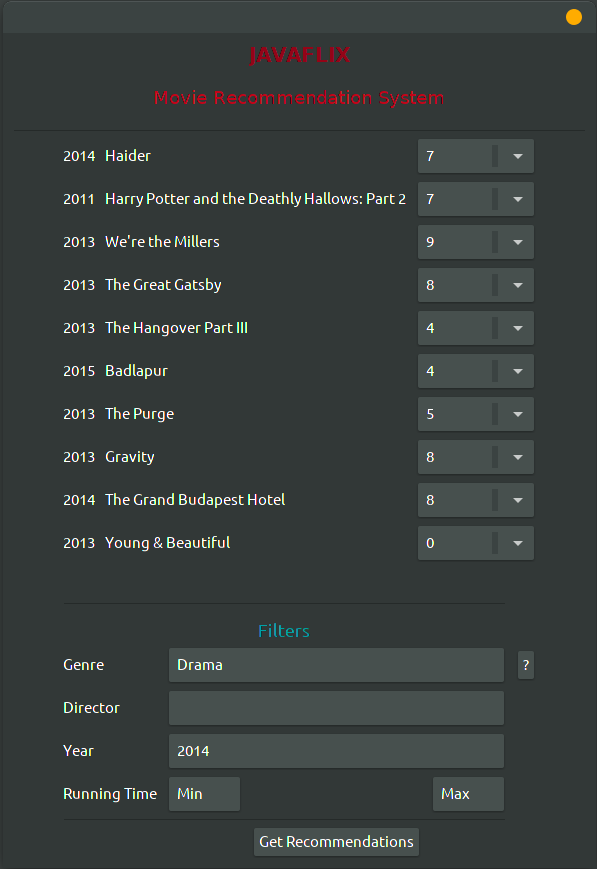The recommendation engine displays a list of 10 movies to the user and allows them to rate them, and then based on their ratings it displays the recommendations.