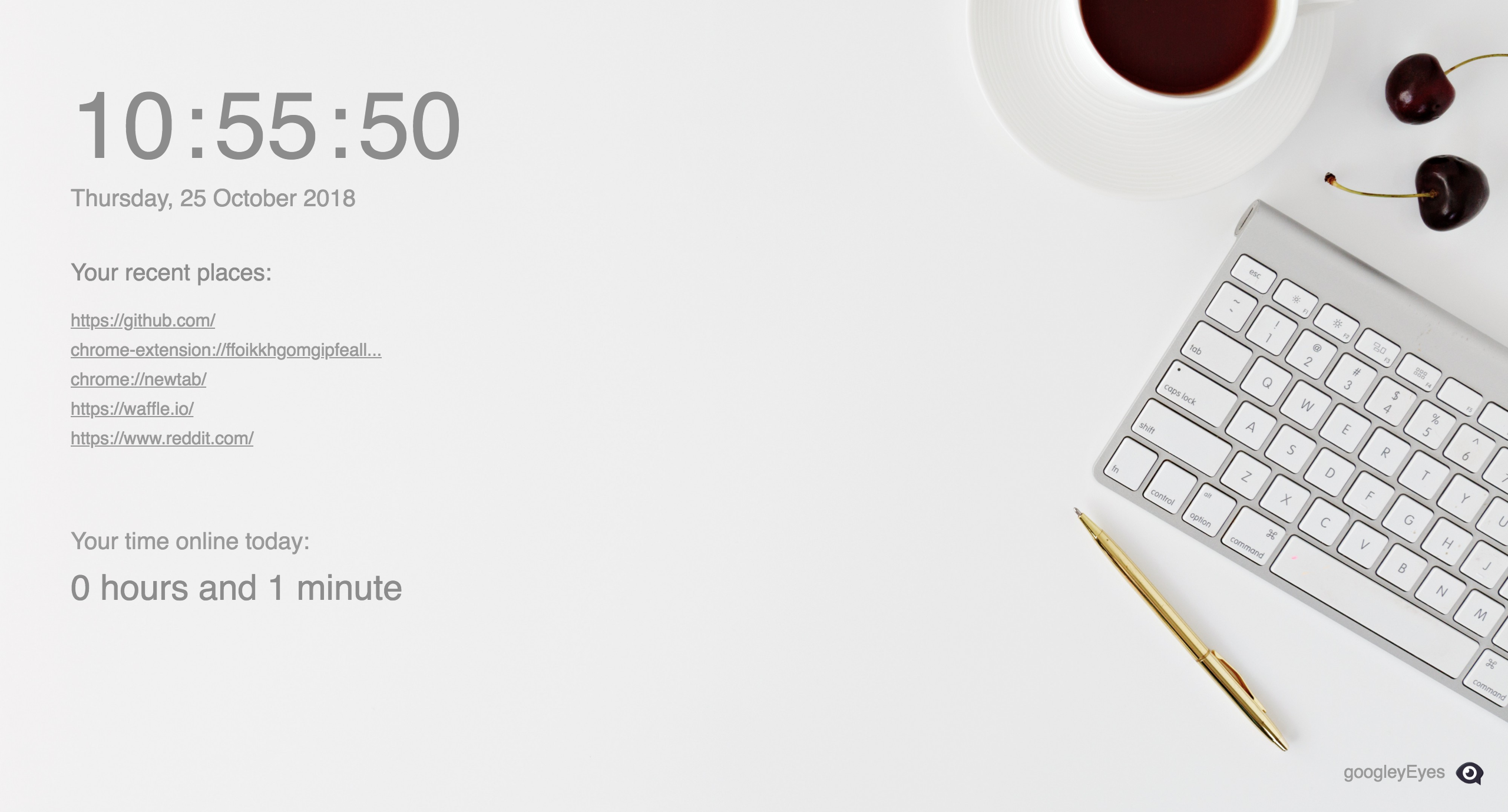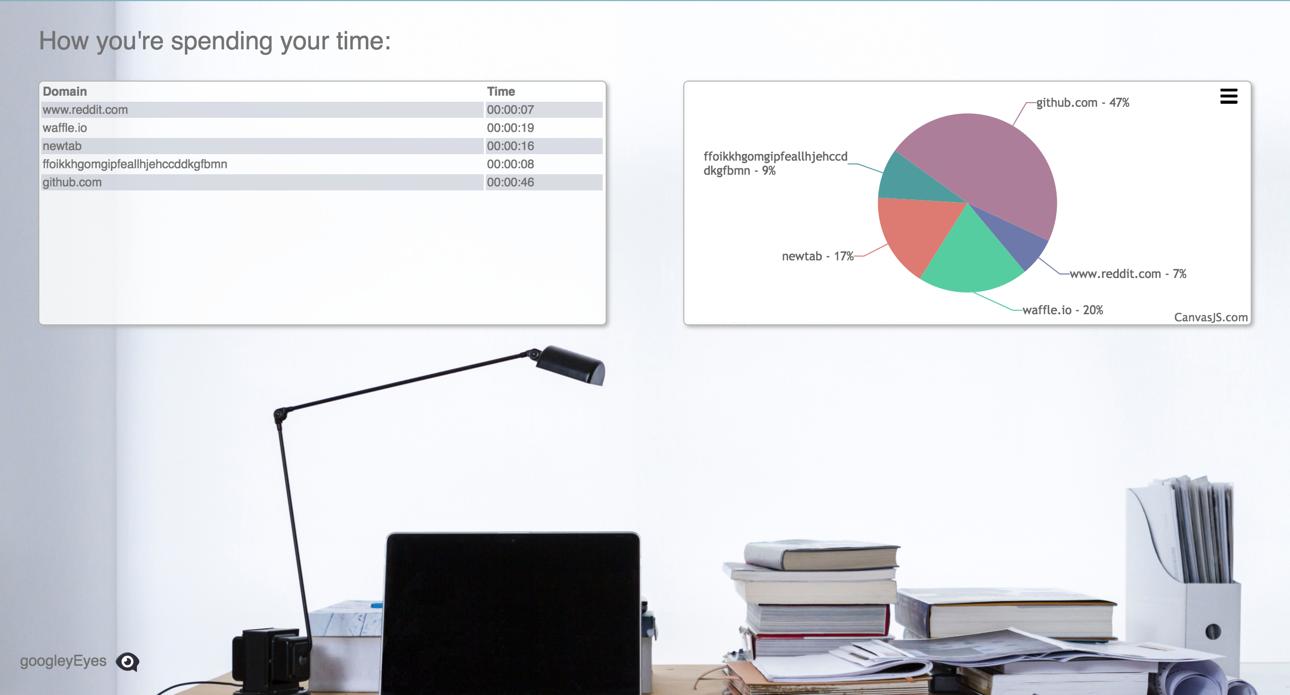 Googley Eyes is a chrome extension that monitors your browser activity and presents you with metrics of website usage.