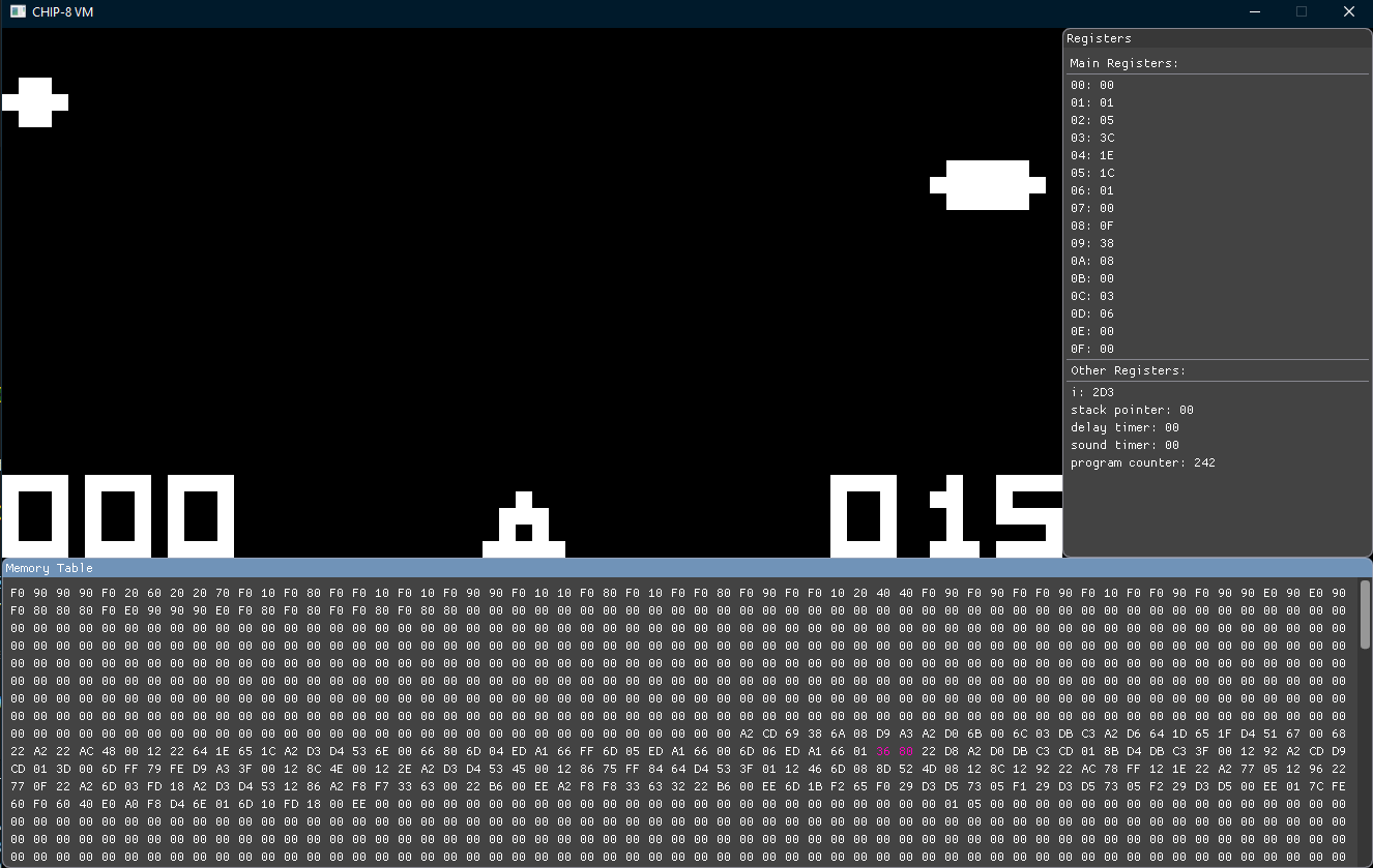 Chip-8-VM-Emulator Chip-8 VM Emulator developed in Rust-lang for learning purposes. Release Mode: Debug Mode: in this mode, you run next instruction by pressing Space Bar Keyboard Bindings ORIGINAL THIS VM 123C 1234 456D QWER 789E ASDF A0BF ZXCV Usage: cargo run [--release] -- -f=roms/PONG