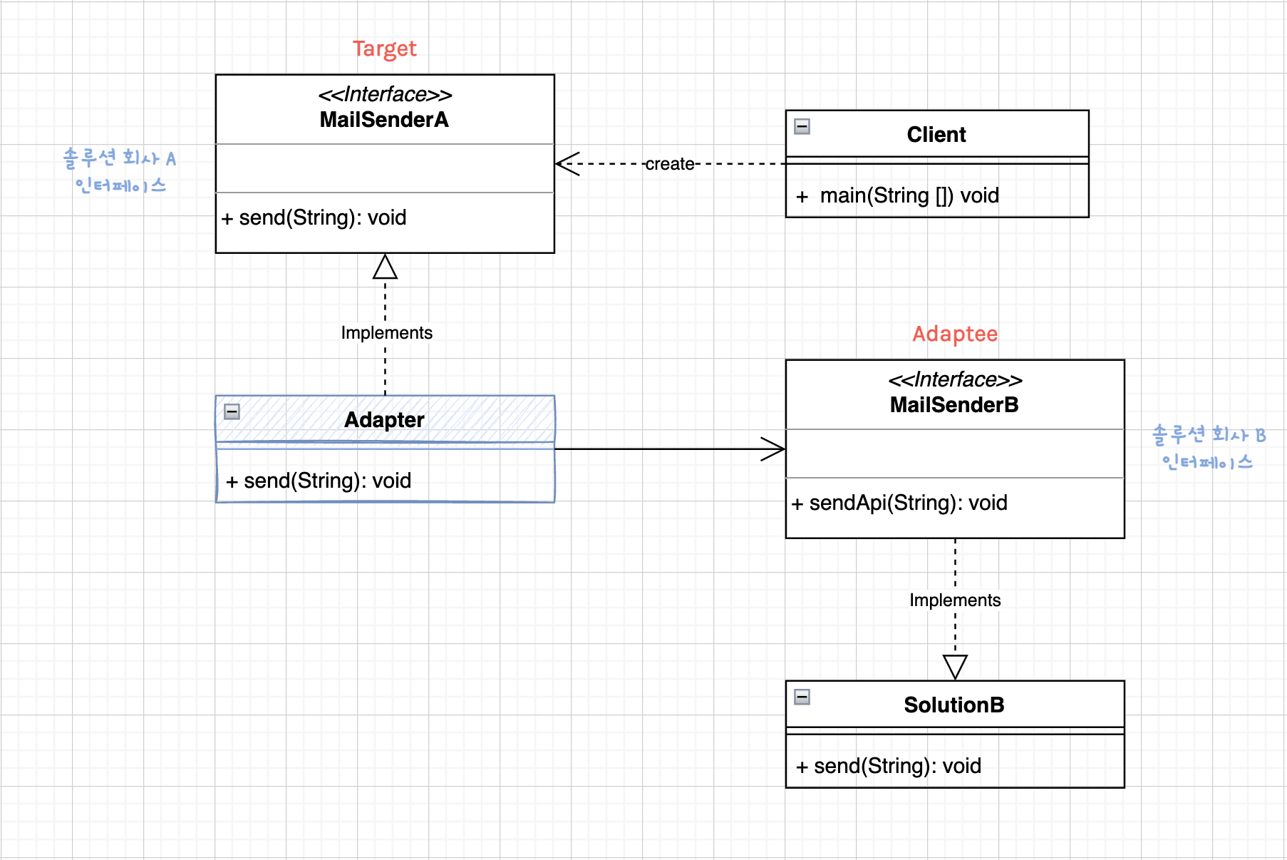 }여기에 클라이언트 입장에서 솔루션 회사 B를 범용성있게 적용하기 위해 Adapter 패턴을 활용할 수 있다.