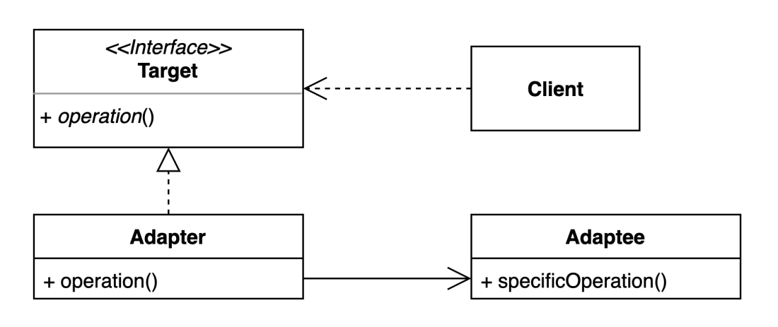 Target:Client가 사용하는 인터페이스Adaptee: 기존에 사용하던 코드Adapter:Client에서Adaptee를 사용하기 위해Target으로 변환 시켜 줌
