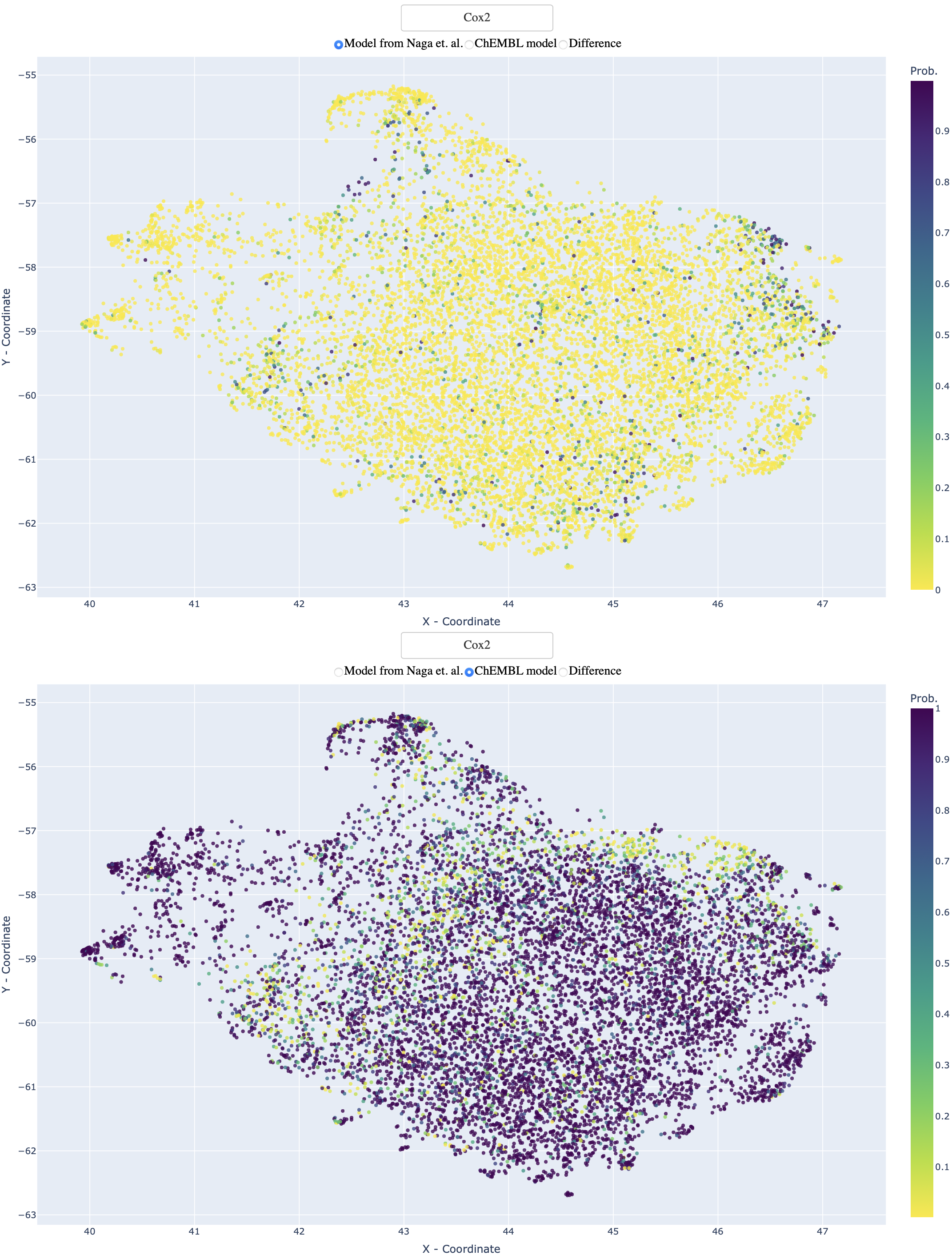 The visualisation of the prediction space of ChEMBL and Naga et. al. models is an important tool for understanding the performance of these models and for identifying differences between them. This visualization is created using Uniform Manifold Approximation and Projection (UMAP) and a custom distance function that takes into account 95% structural similarity of the molecules and 5% proximity in the prediction space.