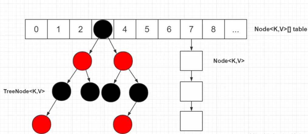 JDK 1.8 的 HashMap 的数据结构如下图所示,当链表节点较少时仍然是以链表存在,当链表节点较多时(大于8)会转为红黑树。