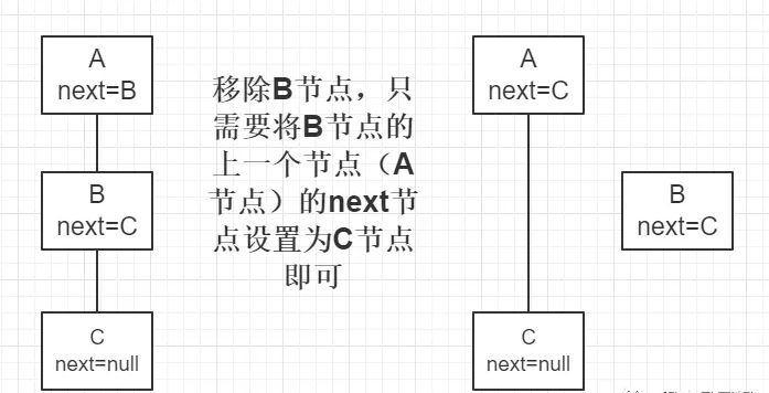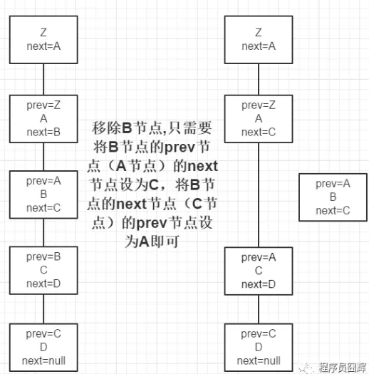 8、红黑树在维护链表结构时,移除一个节点只需如下图操作(红黑树中增加了一个 prev 属性),其他操作同理。注:此处只是红黑树维护链表结构的操作,红黑树还需要单独进行红黑树的移除或者其他操作。