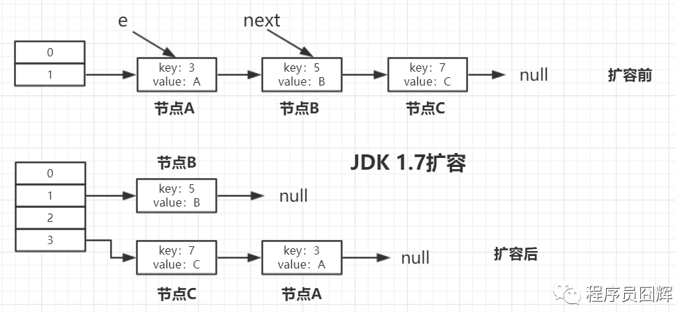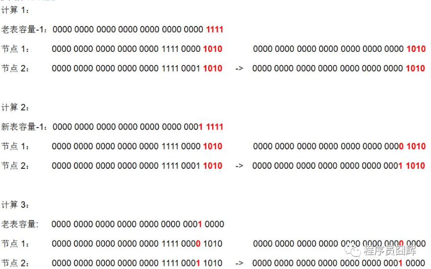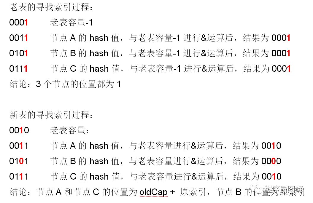 举个例子 前提:我们假设有3个节点,节点 A,节点 B,节点 C,并且假设他们的 hash 值等于 key 值,则按上图扩容的过程模拟如下。 先看下老表和新表计算索引位置的过程:(hash 计算省略前面 28 位 0,只看最后 4 位)