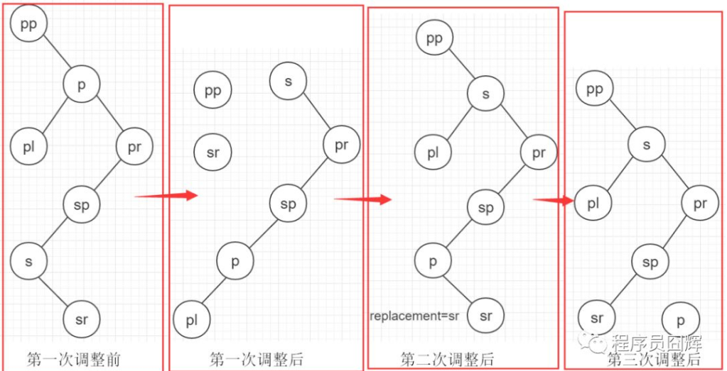 下面的图解是代码中的最复杂的情况,即流程最长的那个,p 节点不为根节点,p 节点有左右节点,s 节点不为 pr 节点,s 节点有右节点。