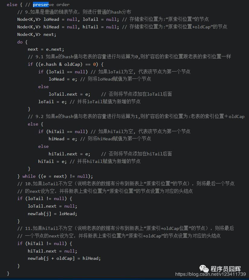 JDK1.8 普通链表的扩容代码,如下图所示,在上文已经分析过了:主要是在一个 do/while 中处理同一个位置的所有节点。