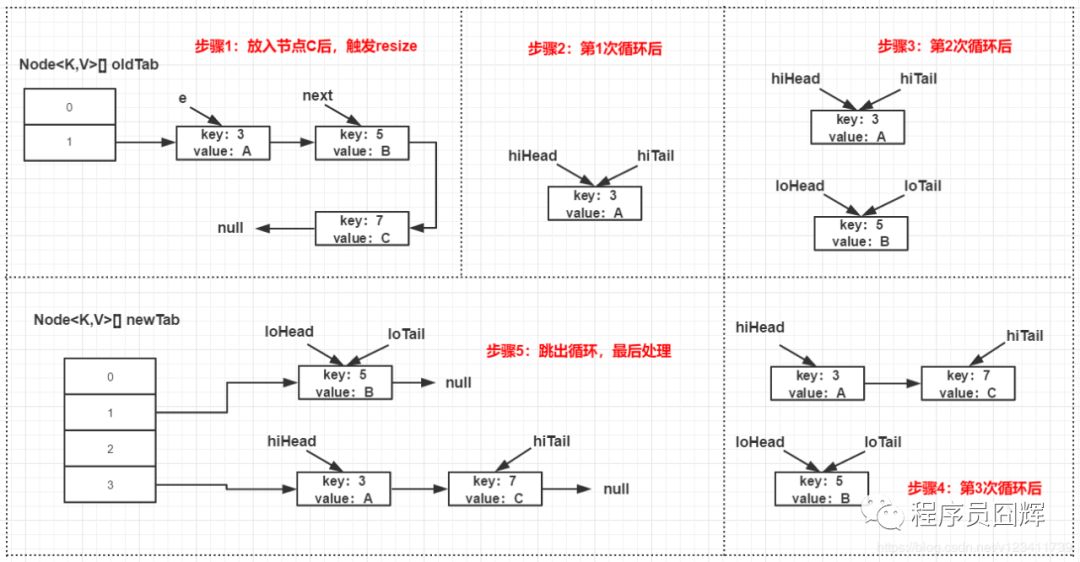 5.导致 HashMap 扩容后,同一个索引位置的节点重 hash 只会分布在两个位置的根本原因是:1)table 的长度始终为 2 的 n 次方;2)索引位置的计算方法为 “(table.length - 1) & hash”。HashMap 扩容是一个比较耗时的操作,定义 HashMap 时尽量给个合理的初始容量值。