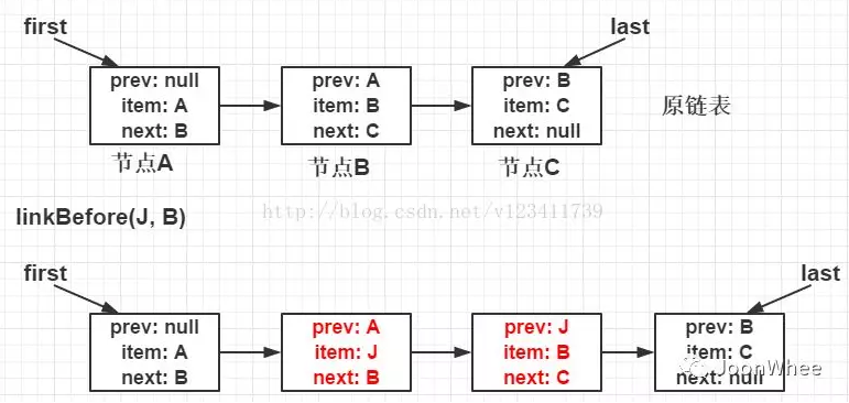 - 如果pred节点为null,则代表succ节点为头结点,要把e插入succ前面,因此将first设置为newNode,否则将pred节点的next属性设为newNode