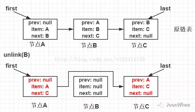 - 如果prev为空,则代表x节点为头结点,则将first指向next即可;否则,x节点不为头结点,将prev节点的next属性指向x节点的next属性,并将x的prev属性清空