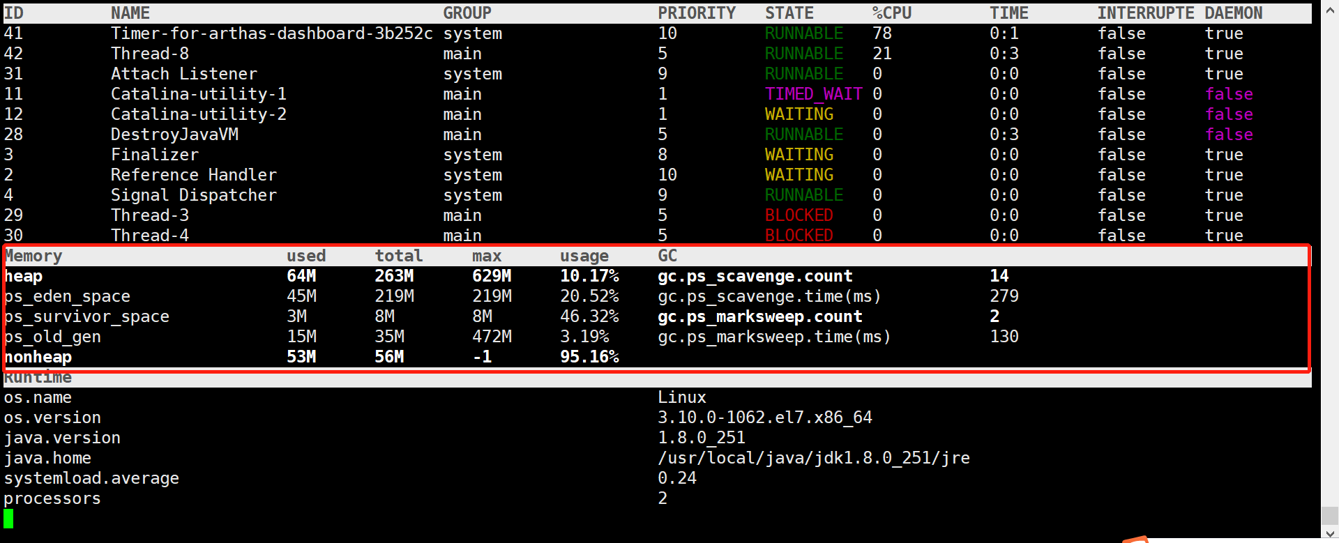 16 http-nio-8080-exec-2 main 5 RUNNABLE 99 0:25 false true