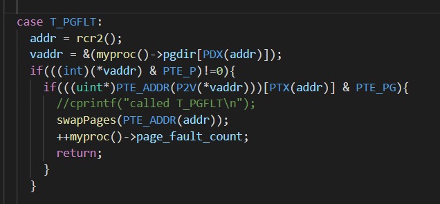 trap(struct trapframe *tf): Modified to call updateNFUState() function in case of timer interrupts to increase the "age" of pages when NFU paging scheme is being used. Introduced changes to handle a page fault by defining T_PGFLT for trap 14. On T_PGFLT being called, it executes the supplied service routine handled by the swapPages() function. The codelet for handling pagefault is as follows:
