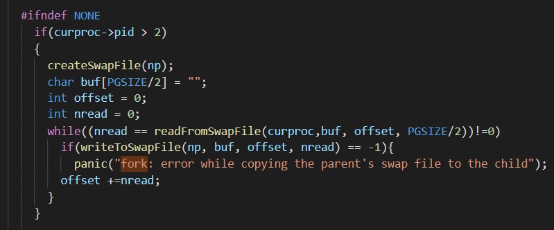 fork() system call: Copies the meta data of a process including swap_space_pages and free_pages arrays, # of pages in swap file and main memory to the child process. However, # page faults and # page swaps are not copied to the child. Creates a separate swap file for the child process to hold copies of the swapped out pages. This is done to enable copy-on-write. The codelet for making swap file for child process is: