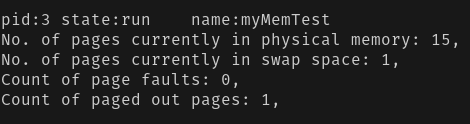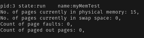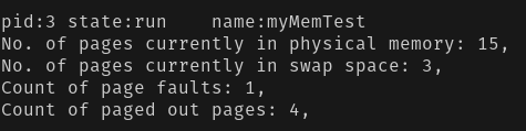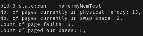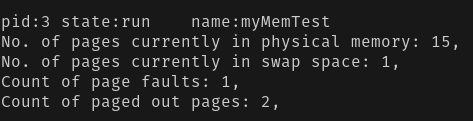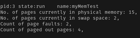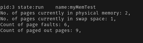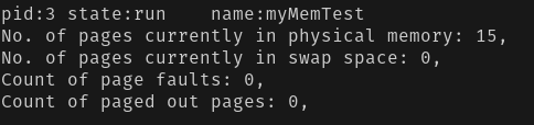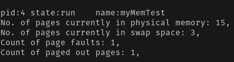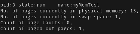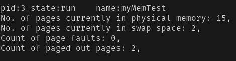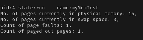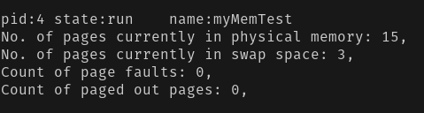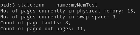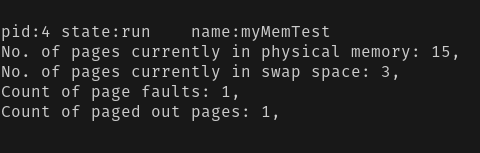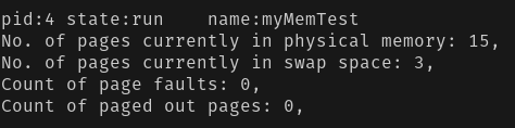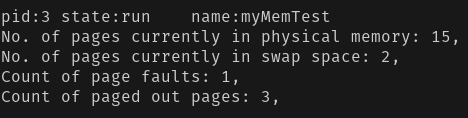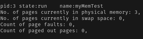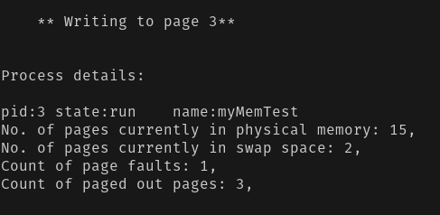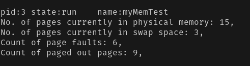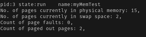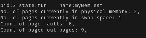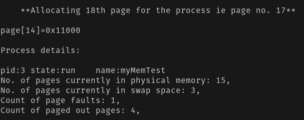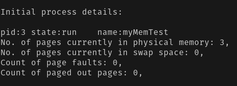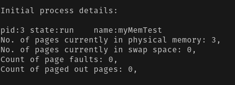 - If we add extra tabs to the printf() statements in myMemTest eg: printf("** Process starts executing **"), initial pages allocated to a page are 4 instead of usual 3. The reason for this can be that the page 0 contains program memory and adding extra tabs is equivalent to adding extra spaces which intern will increase the program memory.
