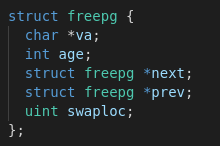 freepg: Node of linked lists of pages (max = 15) present in the main memory and the swap space.