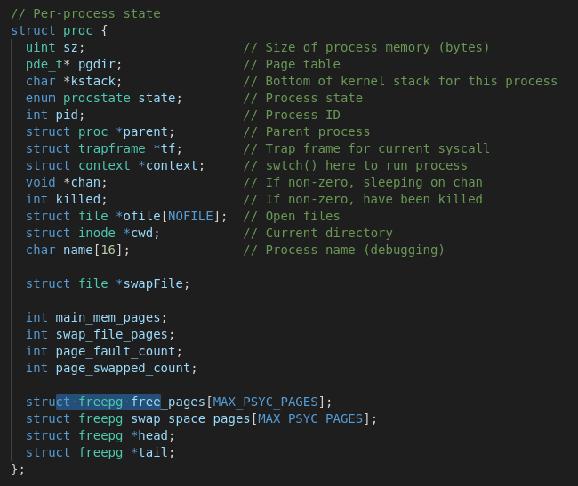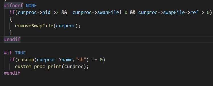 allocproc(void) and exec(): allocproc is responsible for searching an empty process entry in ptable array while exec is responsible for executing it. Changes done: Initialized all the process meta data to 0 and all the addresses to 0xffffffff. If the NONE flag is not defined, exec creates a swap file for every process other than init and sh.