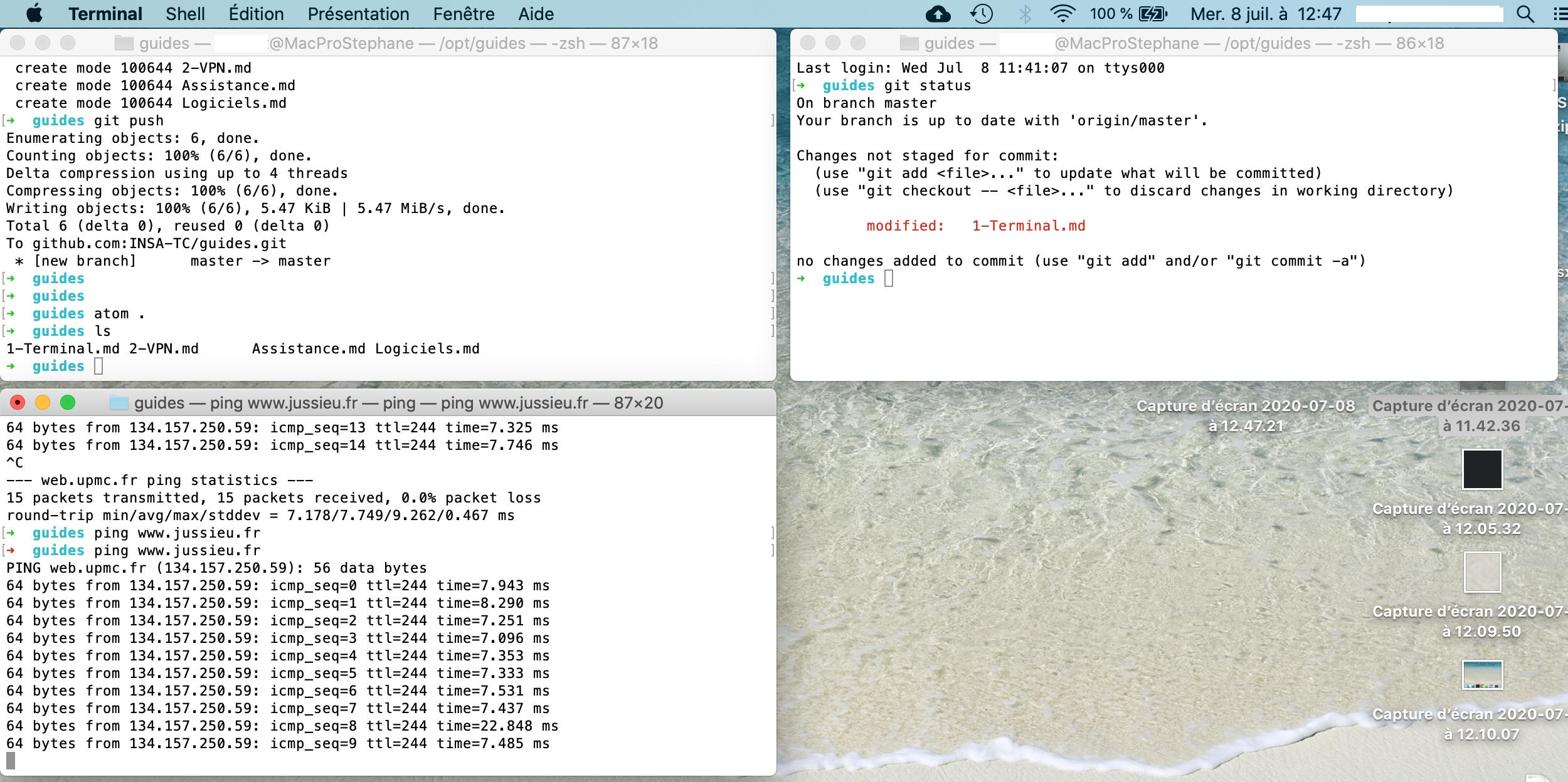 L'image suivante montre un bureau macosx avec une connexion vpn, une connexion ssh et un terminal local.