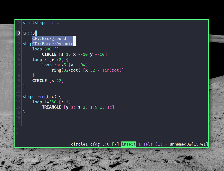 Would be nice to have: better completion, linting using cfdg -C, basic