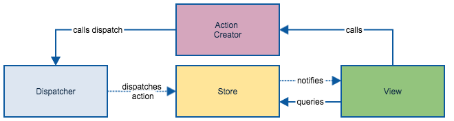 ReactDOM.render(<Button />, document.getElementById('app'));This is great, but what if we want to also store the number of likes in a database on our server? Maybe we'd also like to allow other components in our web app to display the number of likes (accurately). As complexity grows, this approach to storing data can become very cumbersome. Flux architecture prescribes what should happen when an action occurs within our UI (like clicking on a button). The general flow of information looks like this: