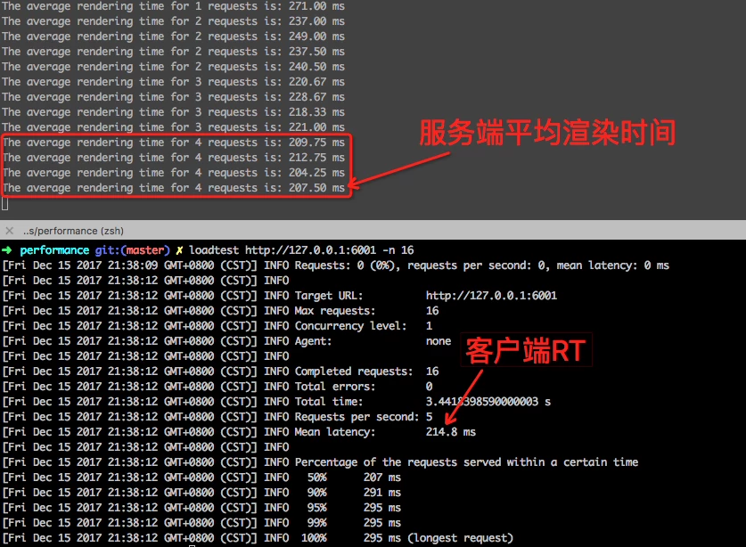 上图是基于Node v8.9.1 和 React@15.5.4, 开4个进程采集到的数据, X轴是最终生成页面节点数量,Y轴红色的线表示RT(包括渲染时间和网络时间), 绿色的柱子表示QPS. 可以看出来: