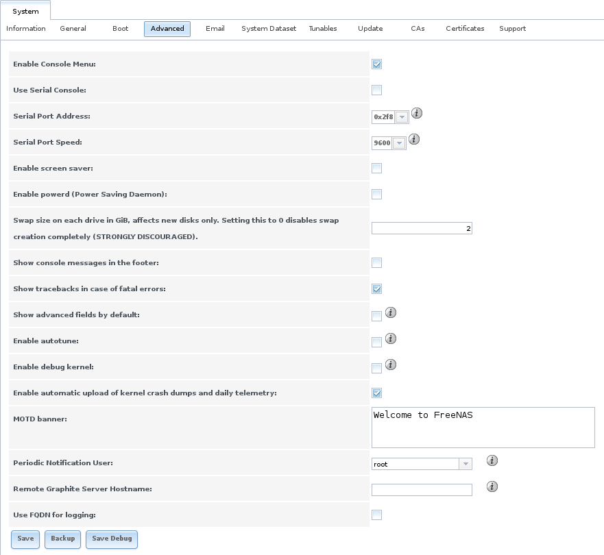 3.FreeBSD rc.conf: rc.conf用于将系统配置参数传递到启动脚本. 由于FreeNAS®针对存储进行了优化, 因袭并不是所有rc.conf都可以配置. 注意, 在FreeNAS®中可以自定义的选项都存储在/tmp/rc.conf.freenas.