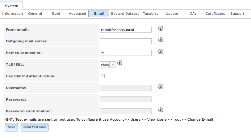 自动脚本每天都会向root账户发送包含磁盘健康等重要信息的邮件. 警告时间也会被发送到root账户. 但是, 管理账户通常不会在FreeNAS®系统中阅读邮件. 那么这些email通常会被额外发送到管理员方便阅读的电子邮箱地址. 通过配置这个可以是的管理员的远程邮箱更容易收到系统问题, 状态变化的报告.