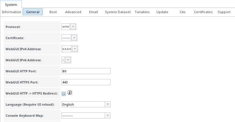 注: 控制台菜单可以通过FreeNAS® GUI 通过在Shell中输入指令__/etc/netcli__. 控制台菜单可以通过System → Settings → Advanced → Enable Console Menu开启或者关闭