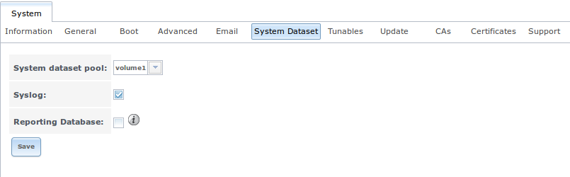 System → System Dataset如下图显示, 可以用来选择永久存放系统数据集的存储池. 系统数据集保存了debug核心文件, Samba4的metadata比如说 账户/用户组的缓存以及分享等级权限. 如果FreeNAS®系统设置为域名控制器, 所有的域名控制状态也都会被保存, 包含了域名控制器的账户和用户组.