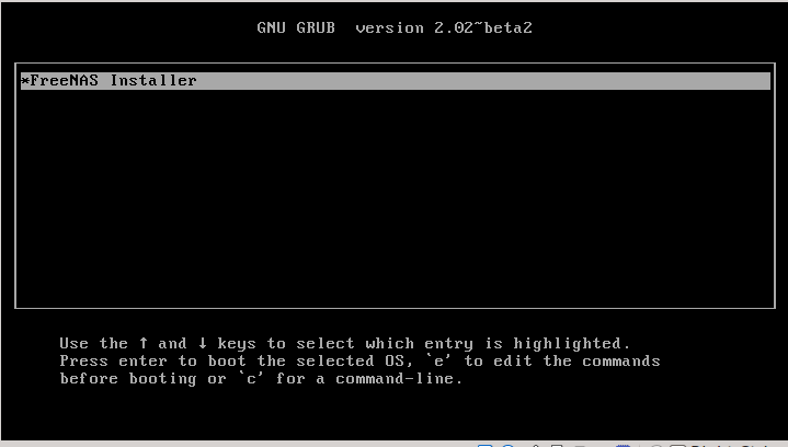 1.将安装介质插入电脑, 并且从该介质启动, FreeNAS® 安装 GRUB 菜单如图所示.