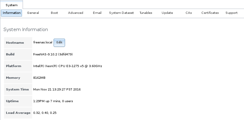 当FreeNAS®的系统内存小于8GB时, 会降低性能, 同时有可能发生一些错误, 所以在使用FreeNAS®存储数据之前, 建议添加足够的内存.