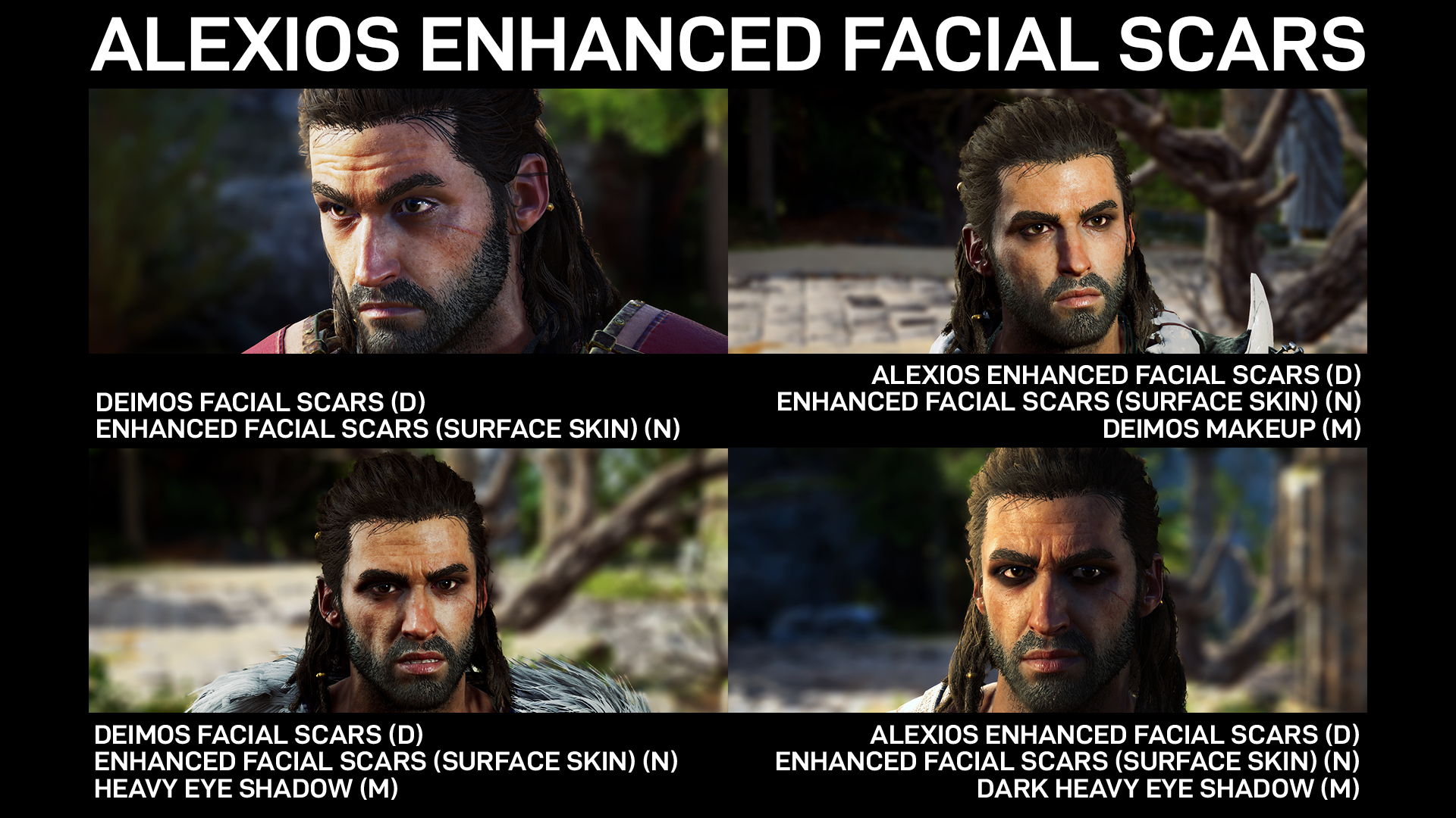Same idea as Kassandra's Enhanced Facial Scars, this mod enhances Alexios's facial scars, and applies Deimos assets.