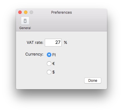 - Settings window for vatrate and currency