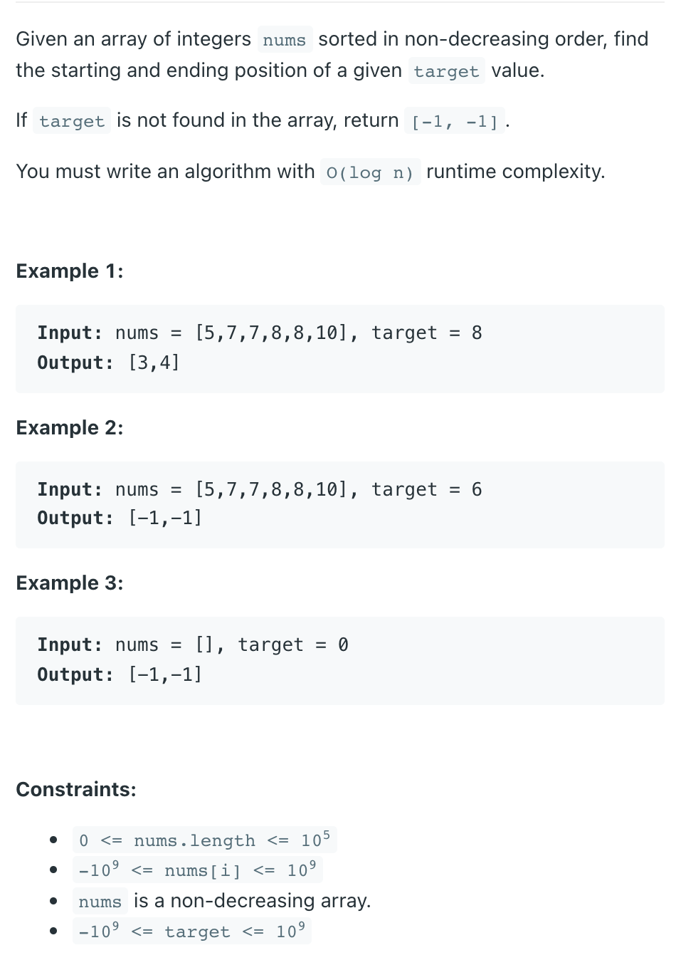 Given an array of integers nums sorted in non-decreasing order, find the starting and ending position of a given target value.