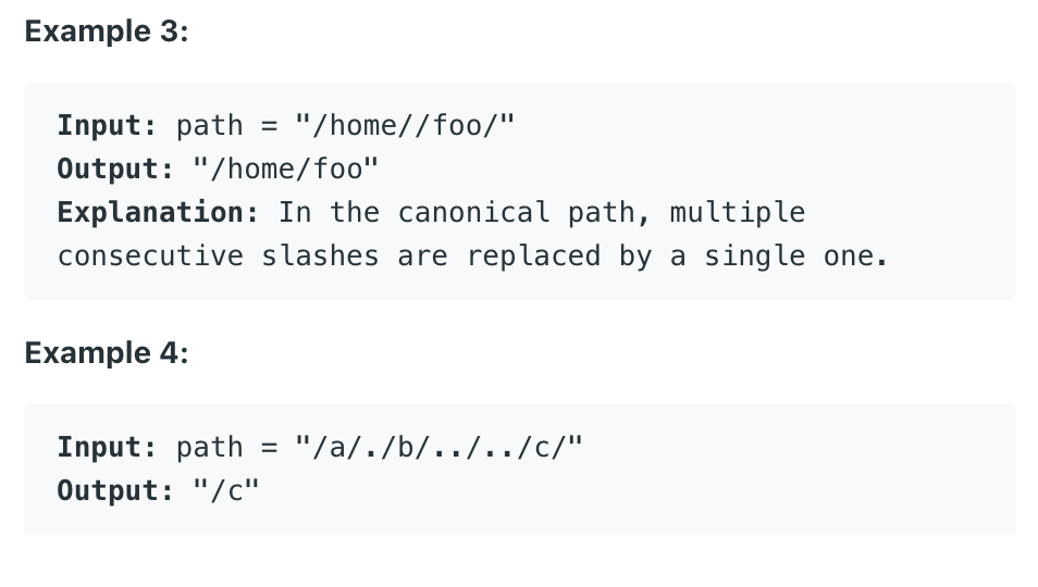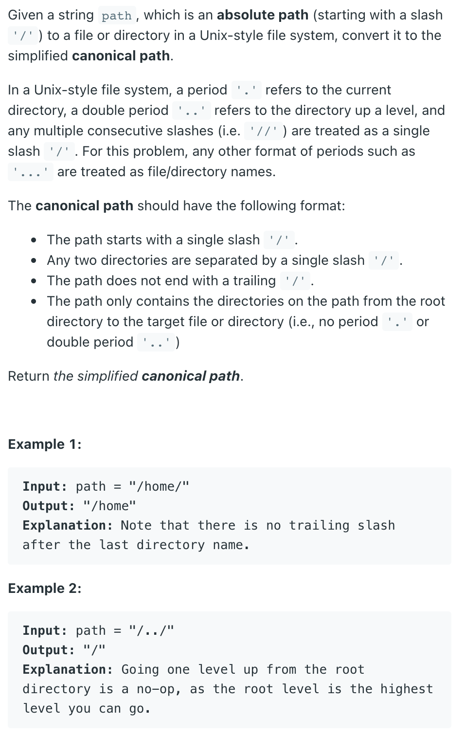 /** * @param {string} path * @return {string} */varsimplifyPath=function(path){letstack=[];path=path.split('/');for(leti=0;i<path.length;i++){if(path[i]==='.'||path[i]==='')continue;if(path[i]==='..')stack.pop();elsestack.push(path[i]);}// add a '/' between each stack block// stack [home -> foo] home/fooreturn'/'+stack.join('/')};