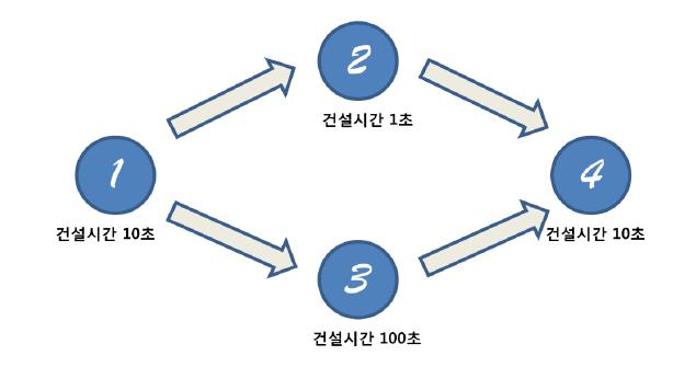 따라서 4번건물의 건설을 완료하기 위해서는 우선 처음 1번 건물을 건설하는데 10초가 소요된다. 그리고 2번 건물과 3번 건물을 동시에 건설하기 시작하면 2번은 1초뒤에 건설이 완료되지만 아직 3번 건물이 완료되지 않았으므로 4번 건물을 건설할 수 없다. 3번 건물이 완성되고 나면 그때 4번 건물을 지을수 있으므로 4번 건물이 완성되기까지는 총 120초가 소요된다.