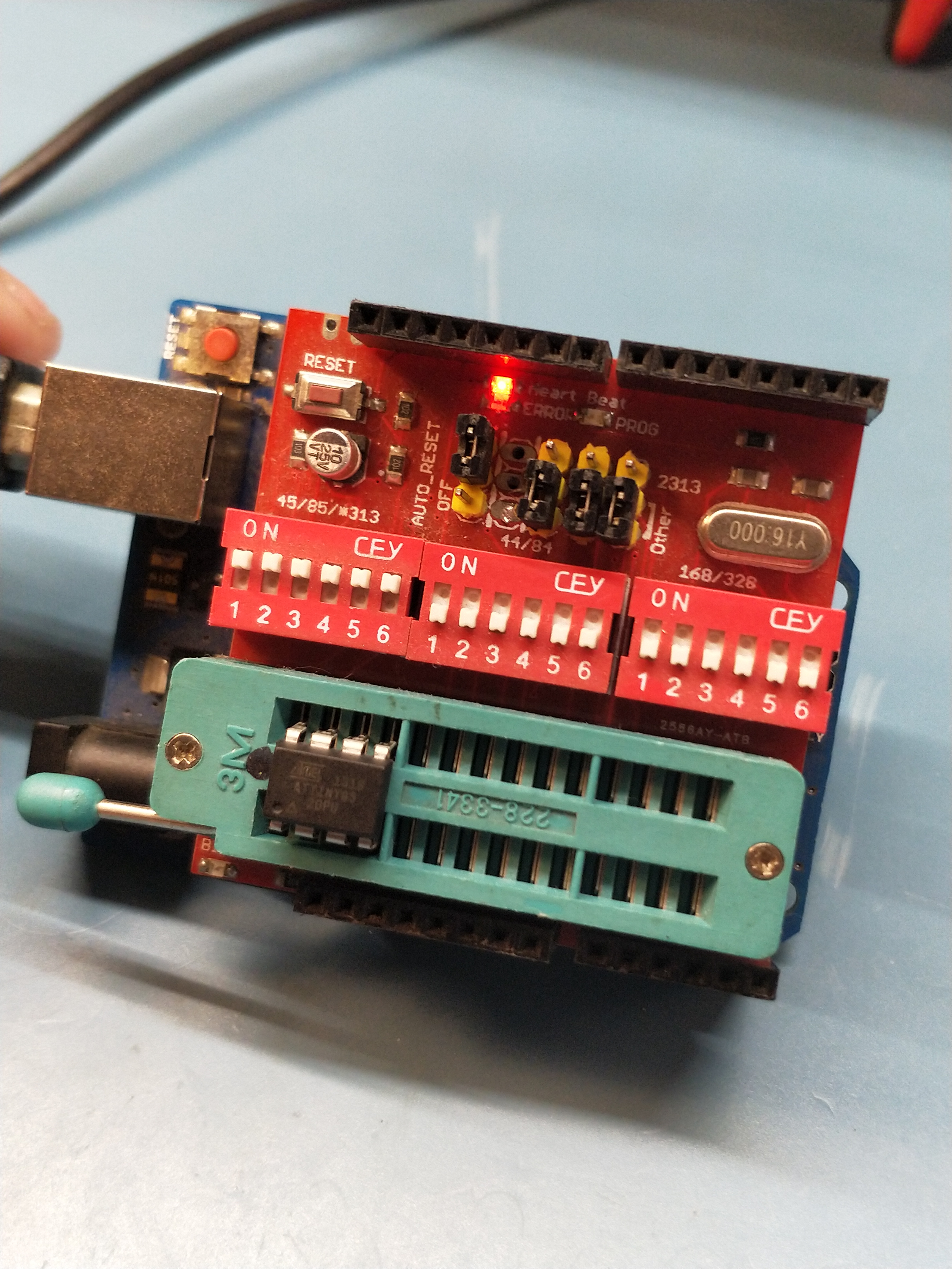 The Arduino Uno is used as an in-system programmer (ISP) through use of the ArduinoISP sketch packaged with Arduino 1.8.3 to program the ATtiny 45/85 targets.